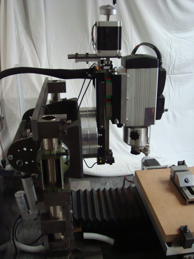 | MODUL-2 Staender Staender mit Drehkopf Staender Tisch müssen nicht bestellt werden. Zum einrichten der Maschine und das Werkstück kann der Drehkopf sich Rechts und Links Drehen. (Das ist sehr einfach zu bedienen ) Für hoch und Hin-unter ist der Kopf von den beiden Seiten einzustellen. Diese Einstellung wird im Hinten angemachten schrittmotor manuell zu bedienen (Elektronisch auf wunsch). Wichtig ist es auch für die schwere Motoren um die für die Paralelitaet des Werkstücks (bzw Fraesers wichtig ). Z-Achsen Konstruktion ist sehr Robust. Für schwere Motoren (Z.B Metall- Bearbeitung) waehrend des Fraesens wegen seines Eigen- Gewichtes des Spindels (Motors) hin und unter Bewegungen (normal 0.010 mm) auf etwa auf null zu bringen ist hinten auf wunsch 0-Stab zu bestellen was nicht teuer ist |